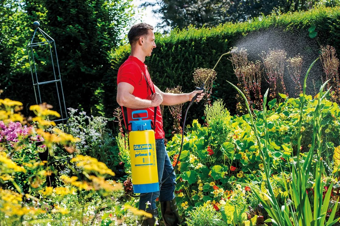 De Gloria druksproeier Prima 8 biedt een reservoirvolume van 8 liter. Daarmee is hij uitstekend geschikt voor het gebruik in grote tuinen. De max. bedrijfsdruk bedraagt 3 bar. Een zuigermanomater met geïntegreerde veiligheidsklep beschermt het apparaat. Dankzij messing sproeistok en verstelbare holle kegel-sproeikop zorgt hij voor de beste sproeiresultaten.