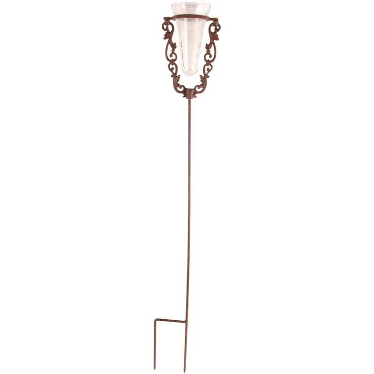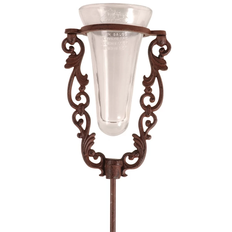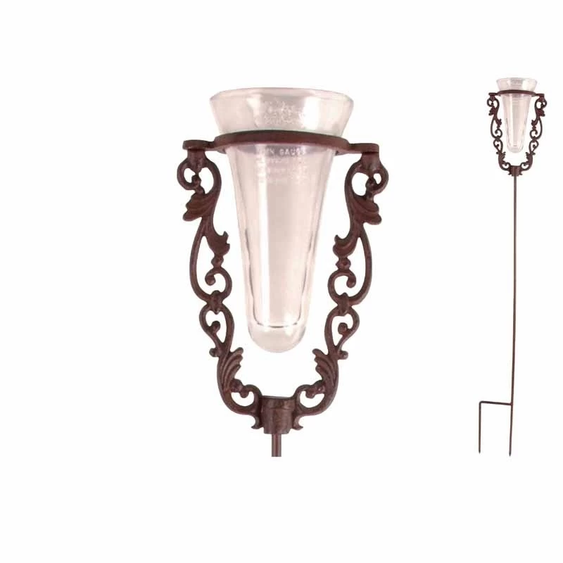 Regenmeter Glas met gietijzeren standaard. 25 mm/m2. Hoeveel heeft het geregend? Met deze decoratieve gietijzeren regenmeter is de hoeveelheid neerslag in een bepaalde periode na te kijken of bij te houden. Dankzij de glazen maatbeker van deze regenmeter kan regen opgevangen worden, en zo kan er eenvoudig nagekeken worden hoeveel regen er in een bepaalde periode is gevallen. De regenmeter kan door middel van de meegeleverde grondpin overal simpel in de grond worden gestoken.